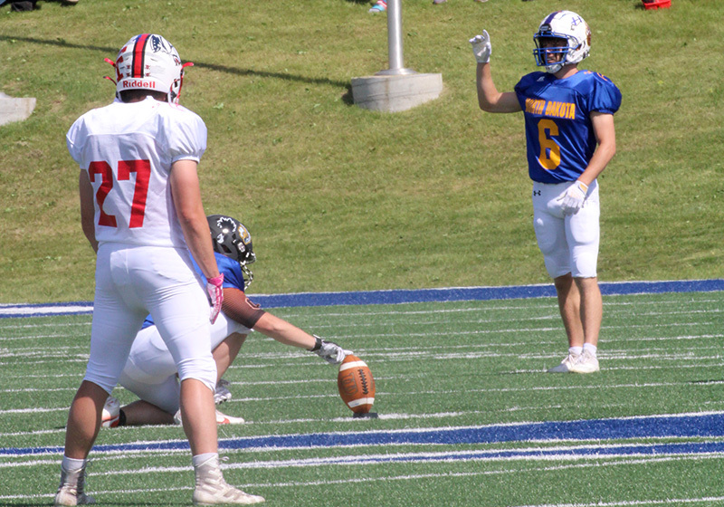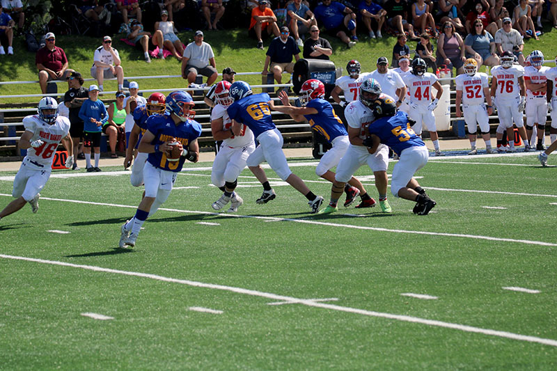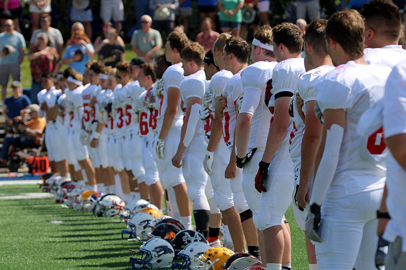A plethora of volunteers helped with not only needed services during the game, but also in ways that helped to make the game-day experience enjoyable. Brian Aune and Mike Carr ran the clock. The Mayville-Portland-Clifford-Galesburg Legion did a beautiful job in presenting our nation’s colors. Flag bearers were Rich Peterson, Harlan Johnson, Alan Kville, and Roger Erickson. Mayville’s own Triplicity, Helen Hoyt, Lori Nelson, and Teresa Agnes, gloriously sang our national anthem. The game referees volunteered their services. They were Ron Nord, Jim Stallard, Red Nordick, Craig Hahn, and Bret Burkholder for the 11-man game, and Jackie Gray, Jim Breen, Scott Frederickson, Bret Niles, and Jess Gross for the 9-man game. Dan Overmoe, Rich Klask, Bob Kozojed, and John Peterson made up the downs crew, and Brogen Erickson and Cole Hutter were ball boys.