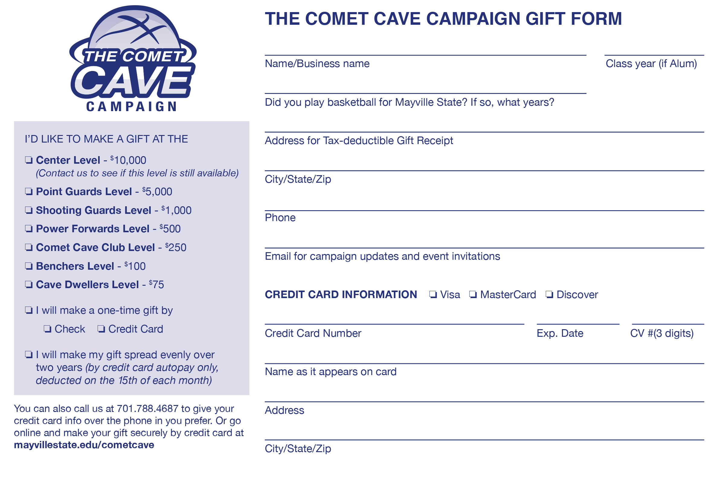 The Comet Cave Campaign will offer a place for everyone who wants to put their name permanently on the finished product. With 33 lockers, comfy furniture, locker benches, big screen TV, and special signage, there is a place for every alum and friend. And when the campaign is complete, all will be invited for a special dedication party. So pick the level at which you would like to give, fill out the gift form, and send it in with your check or credit card info. Or click here to make your gift securely online now. Choose one of the giving levels and make a one-time gift or a gift by credit card over two years. For your convenience, you can also make your gift by credit card over the phone by calling Michelle at 701-788-4687.