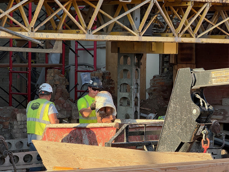 Outside, an elaborate scaffolding system is helping to raise and lower workers as they removed and now will replace brick. Much of the brick could be removed by hand, but in some places, tools were needed. This same exterior scaffolding system was used when building the addition on the west end of the building. When work on the north wall is finished, the scaffolding will be moved to the east end to assist workers as the east addition is built.